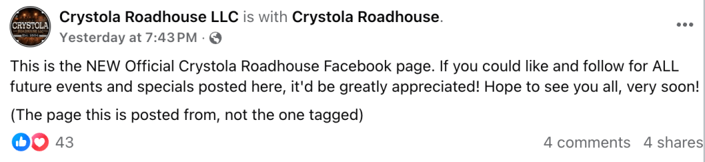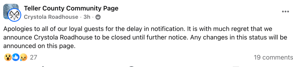 Recently, a post began circulating in local Facebook groups claiming that Crystola Roadhouse would be “closed until further notice.” The message appeared to come from the business’s original Facebook presence and apologized to loyal customers while offering little additional explanation.